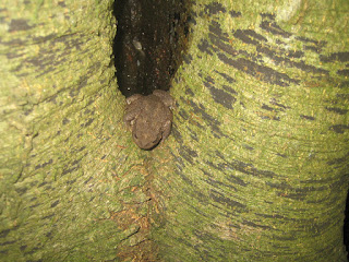 Da rechts sitzt übrigens eine kleine Kröte in einem Baum im Wald.